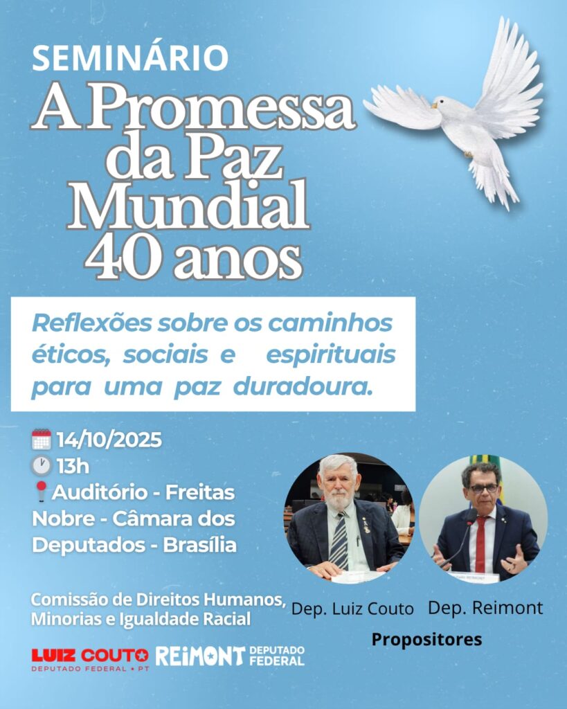Nesta terça-feira, 14 de outubro de 2025, a Comissão de Direitos Humanos, Minorias e Igualdade Racial (CDHMIR) da Câmara dos Deputados promove o Seminário Comemorativo pelos 40 anos do documento “A Promessa da Paz Mundial”, publicado em 1985 pela Casa Universal de Justiça. A iniciativa partiu dos deputados Reimont (PT/RJ), presidente da CDHMIR, e Luiz Couto (PT/PB), que propuseram o evento por meio do Requerimento nº 65/2025. O seminário será realizado no Auditório Freitas Nobre, na sede da Câmara dos Deputados, em Brasília, com início às 13h. Publicado há quatro décadas, o documento “A Promessa da Paz Mundial” tornou-se uma referência internacional por propor uma abordagem ética, cooperativa e espiritual para a construção da paz. Seu conteúdo aborda temas como justiça social, igualdade de gênero, fraternidade entre os povos e a urgência de superar as divisões ideológicas, econômicas e culturais. O seminário reunirá especialistas, acadêmicos e representantes de organizações da sociedade civil comprometidas com a promoção dos direitos humanos e da cultura de paz. Entre os nomes confirmados estão: Marcos Alan, acadêmico e representante da Comunidade Bahá’í; Roberta Maschietto, pesquisadora na área de paz e conflito; Nathalia Polachi, do Instituto Sou da Paz; Tayanne Galeno, do Instituto Alana; Guacira de Oliveira, do CFEMEA (Centro Feminista de Estudos e Assessoria); Letícia Leobet, do Geledés – Instituto da Mulher Negra. Para os organizadores, o evento é mais do que uma celebração histórica. Trata-se de um chamado à ação diante dos desafios contemporâneos para a construção de uma convivência pacífica, justa e igualitária, num mundo ainda marcado por conflitos, desigualdades e discursos de ódio. “A Promessa da Paz Mundial”, ainda atual após 40 anos, nos convida a pensar a paz não como ausência de guerra, mas como um processo ativo de construção de justiça social e solidariedade entre os povos. A proposta do seminário é fomentar esse debate dentro do Parlamento, envolvendo sociedade civil, academia e lideranças comprometidas com os direitos humanos. O evento será aberto ao público e transmitido pelos canais oficiais da Câmara dos Deputados. Serviço: O quê: Seminário “A Promessa da Paz Mundial: 40 anos” Quando: Terça-feira, 14 de outubro de 2025, às 13h Onde: Anexo II Plenário 02 Auditório Freitas Nobre, Câmara dos Deputados – Brasília Realização: Comissão de Direitos Humanos, Minorias e Igualdade Racial (CDHMIR)