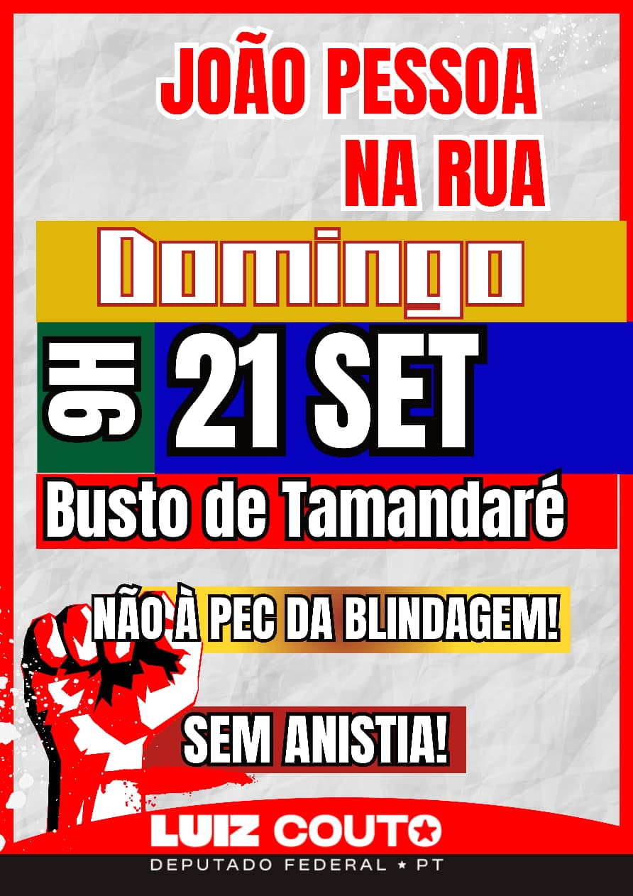 Neste domingo, 21 de setembro, às 9h, no Busto de Tamandaré, a capital paraibana será palco de um grande ato popular contra a chamada PEC da Blindagem de Parlamentares, uma proposta que representa um grave retrocesso e uma afronta direta à Justiça e à vontade do povo.